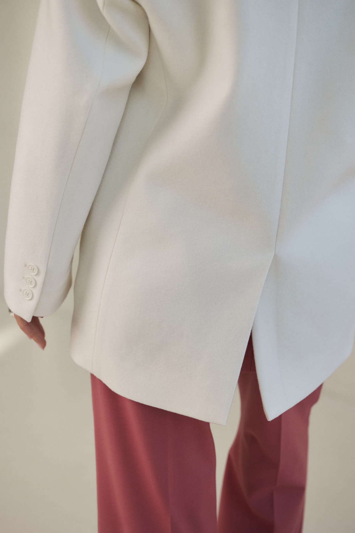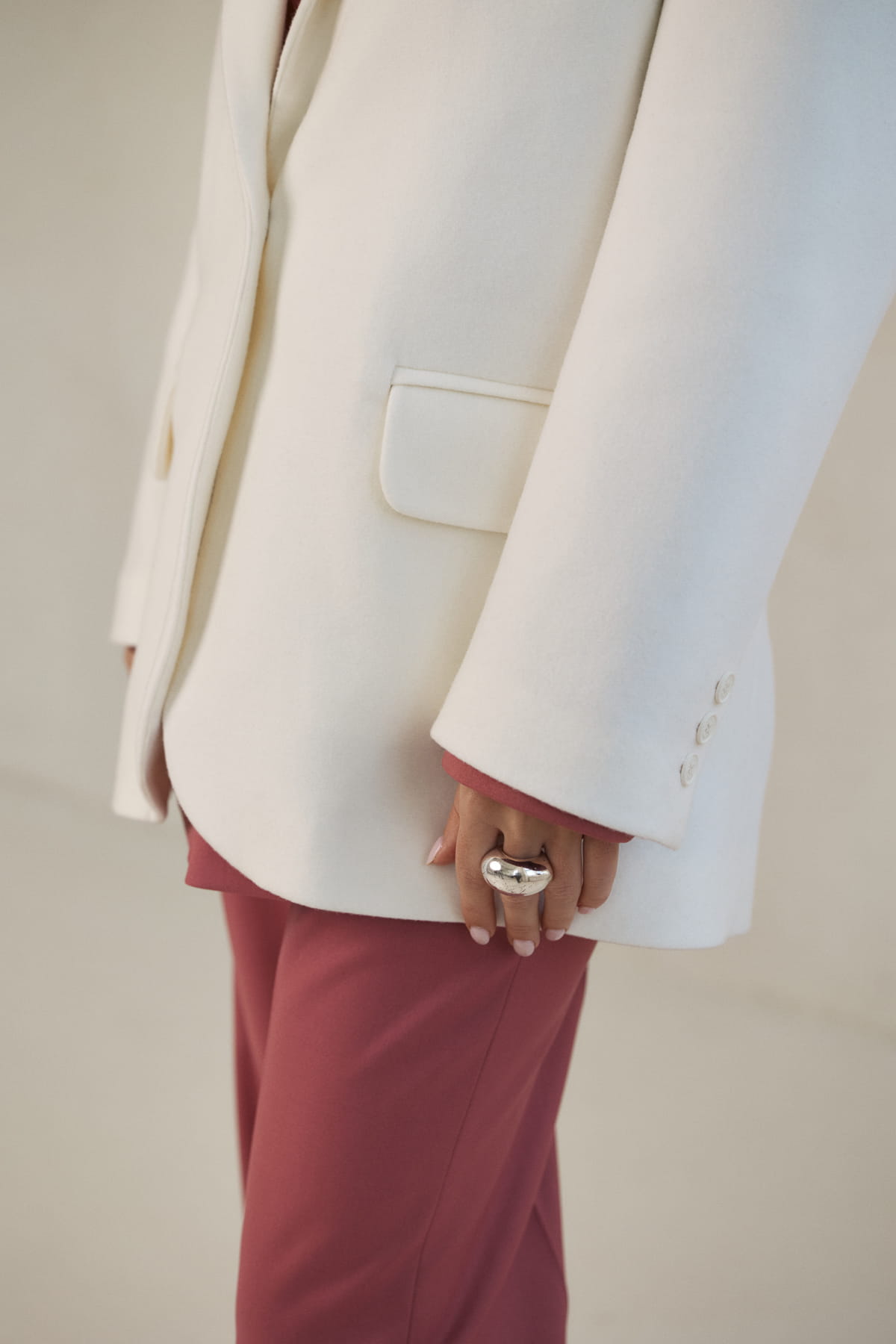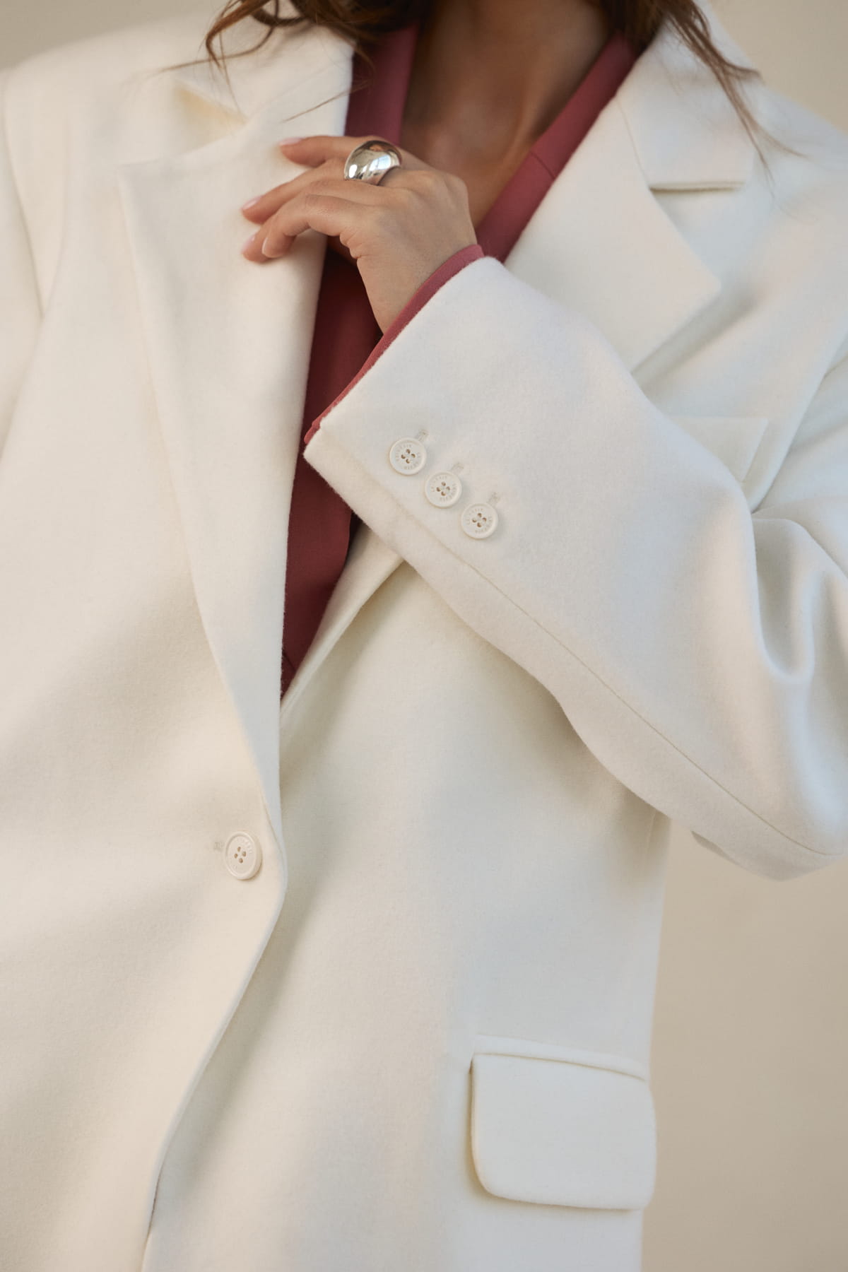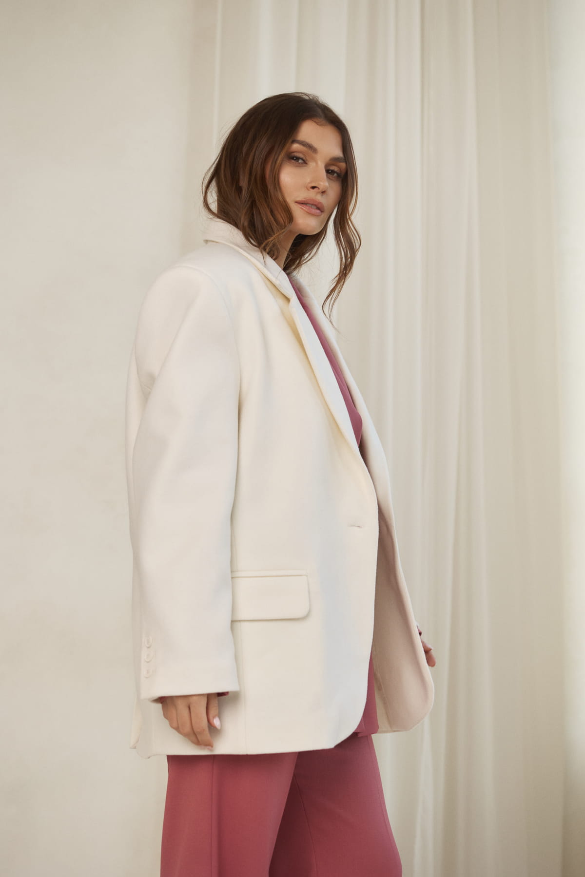 Marynarka wyróżnia się charakterystycznym krojem oversize, który nadaje sylwetce modowy i elegancki wygląd. Duże poduszki w ramionach podkreślają linię barków, nadając konstrukcji wyrazistej formy inspirowanej nowoczesnym tailoringiem.