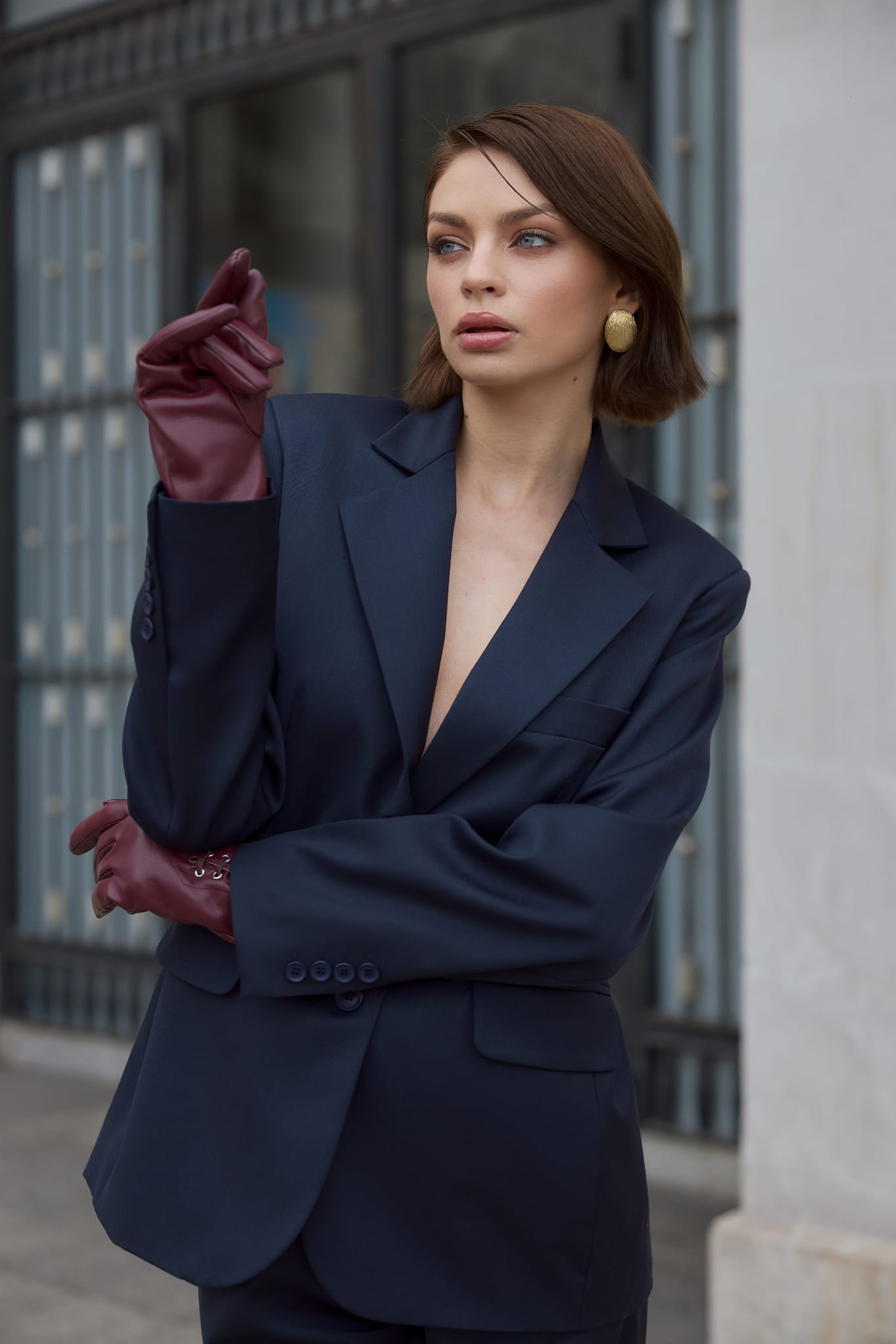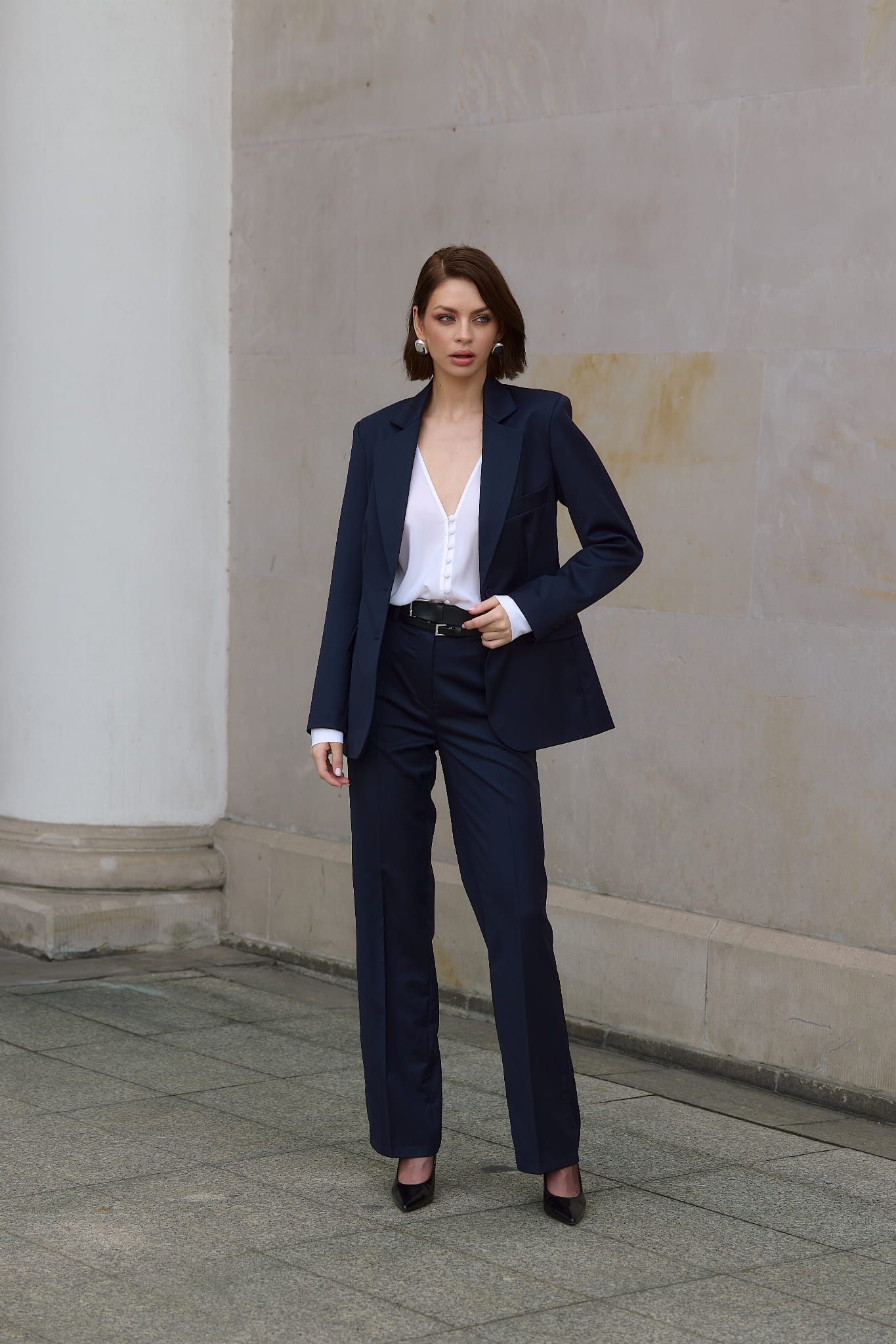 - marynarka tworzy komplet garniturowy z spodniami o prostym kroju oraz luźnymi spodniami na gumce