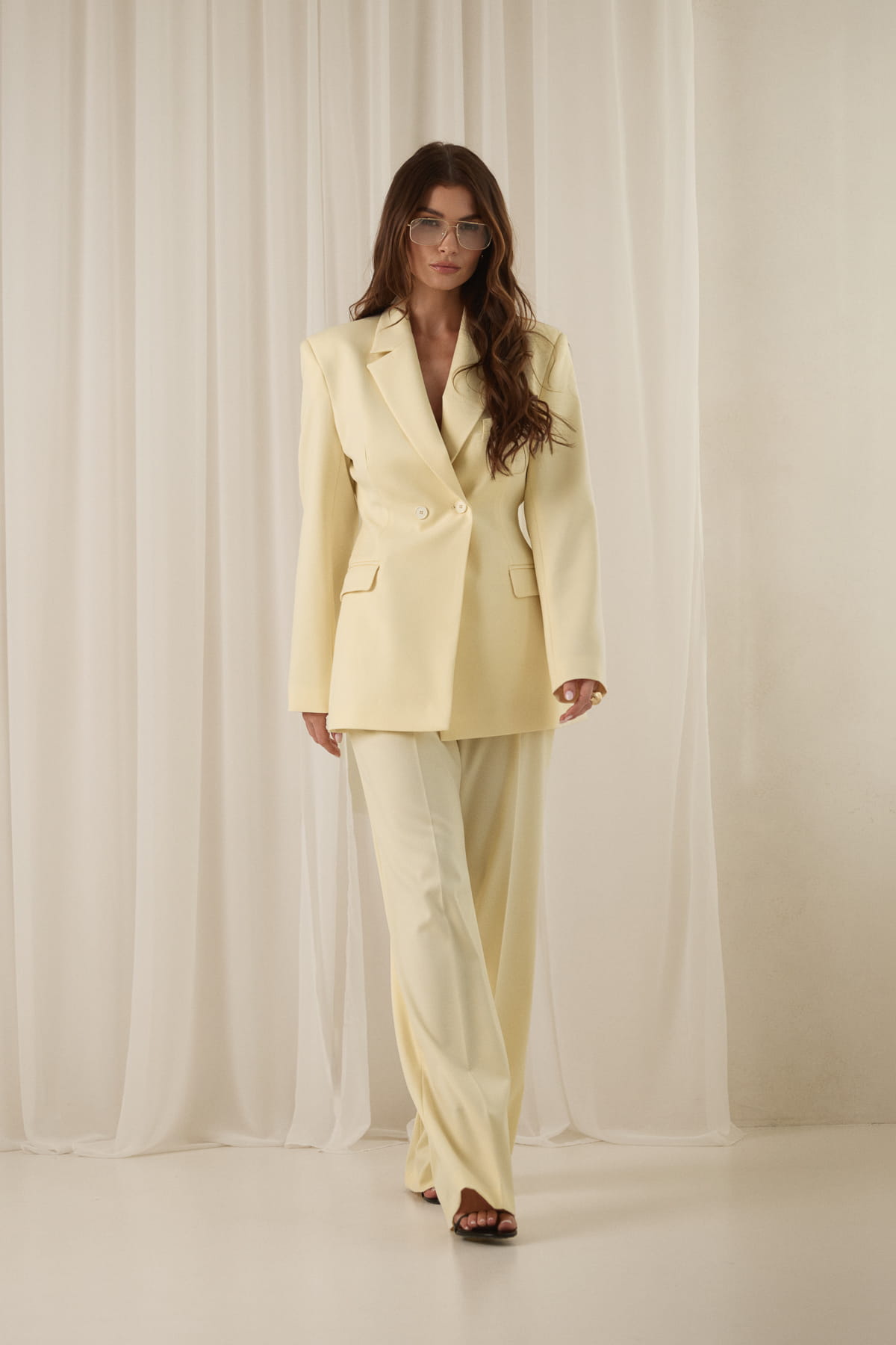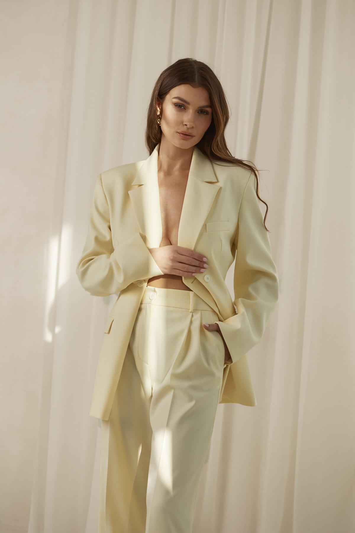Model doskonale prezentuje się w komplecie z marynarką Hailey yellow butter, tworząc elegancki, nowoczesny garnitur damski.