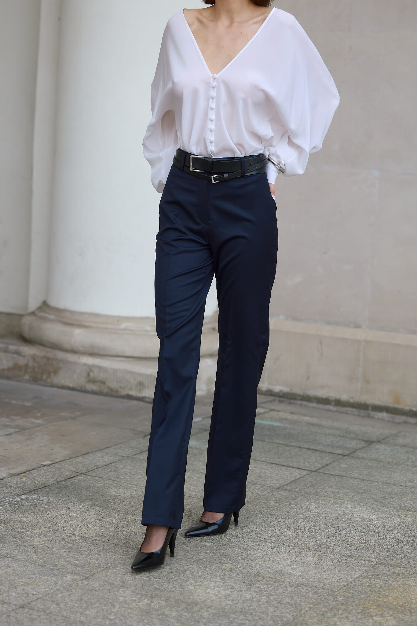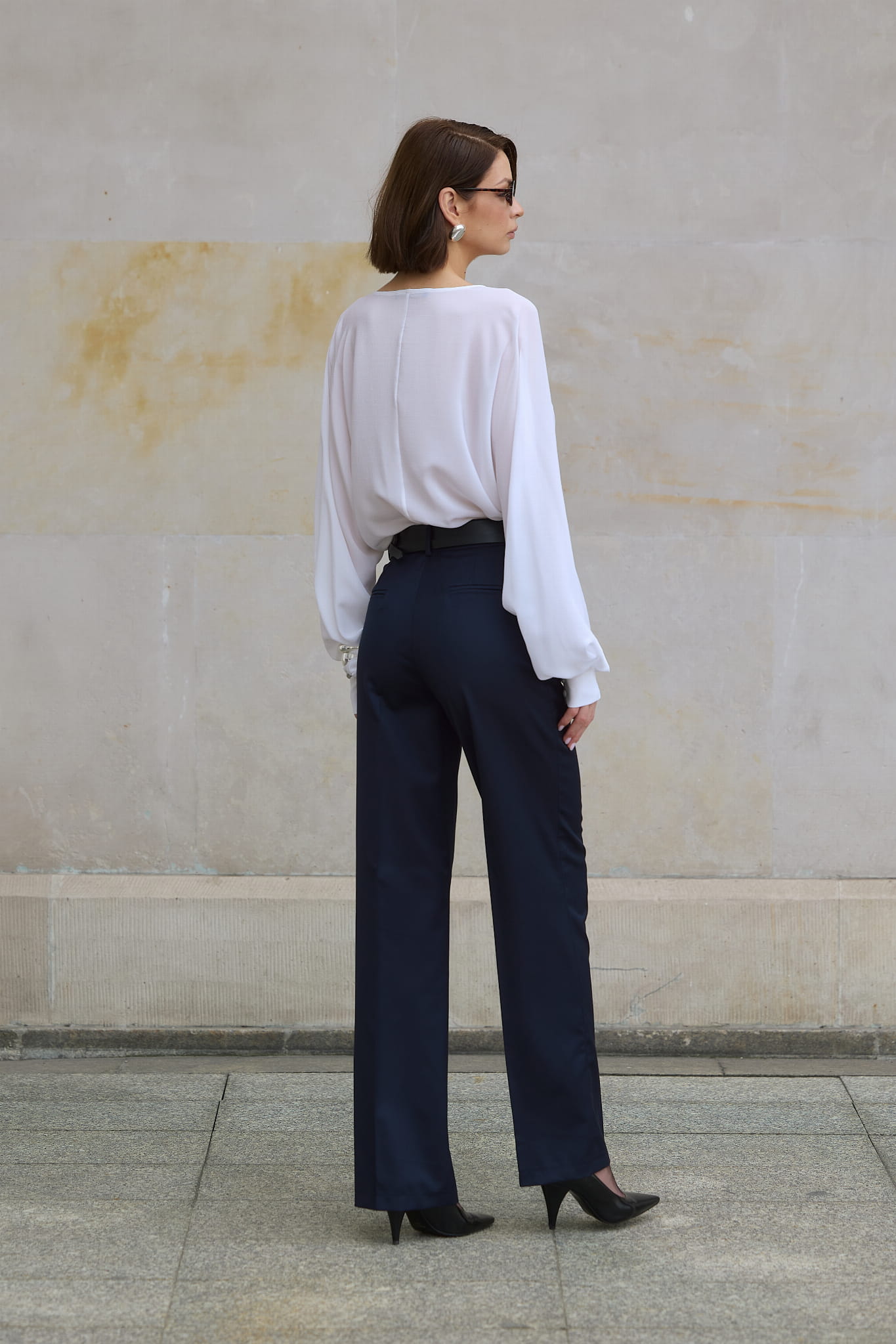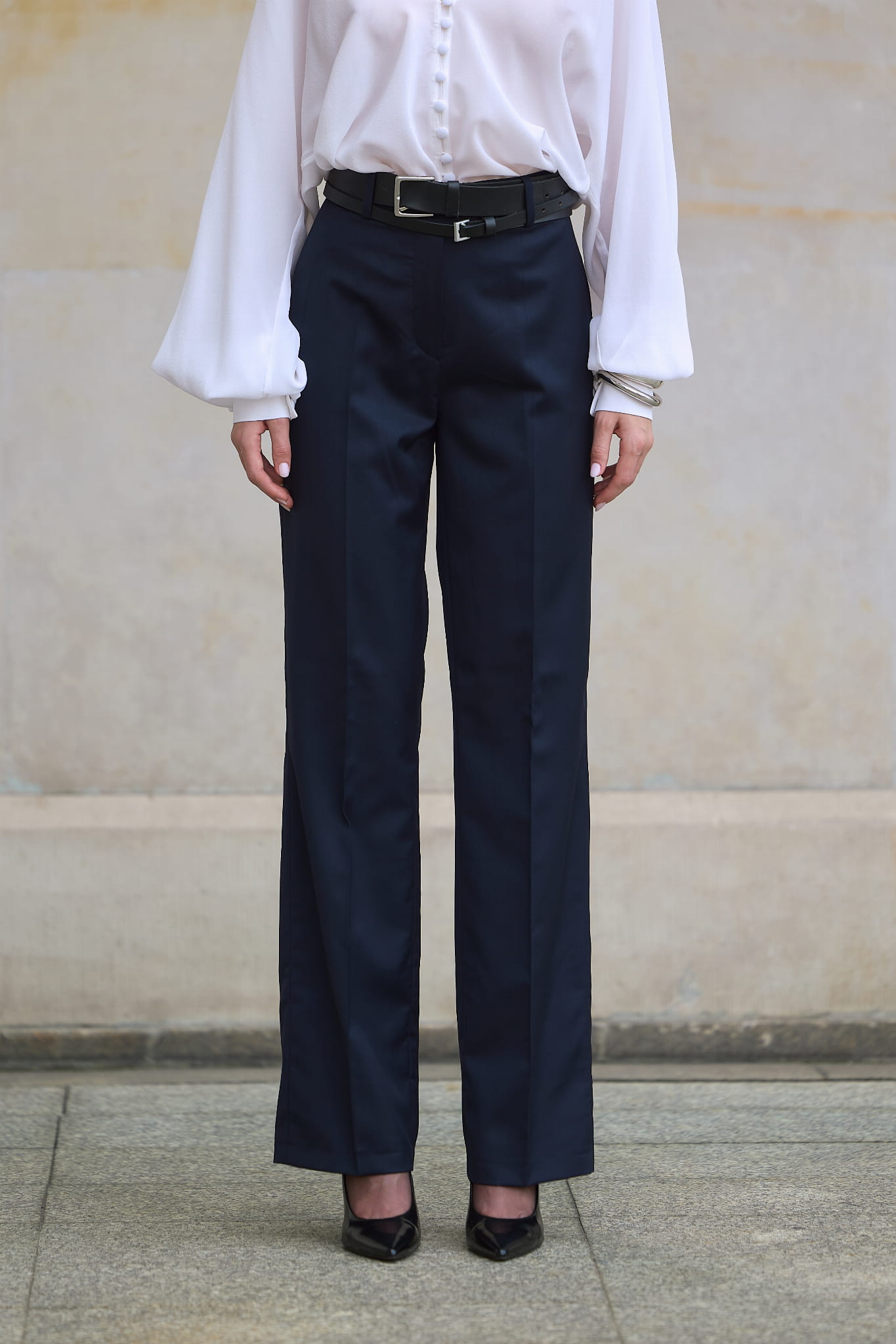 - Wysoki stan, klasyczne nogawki w kant lekko dopasowane