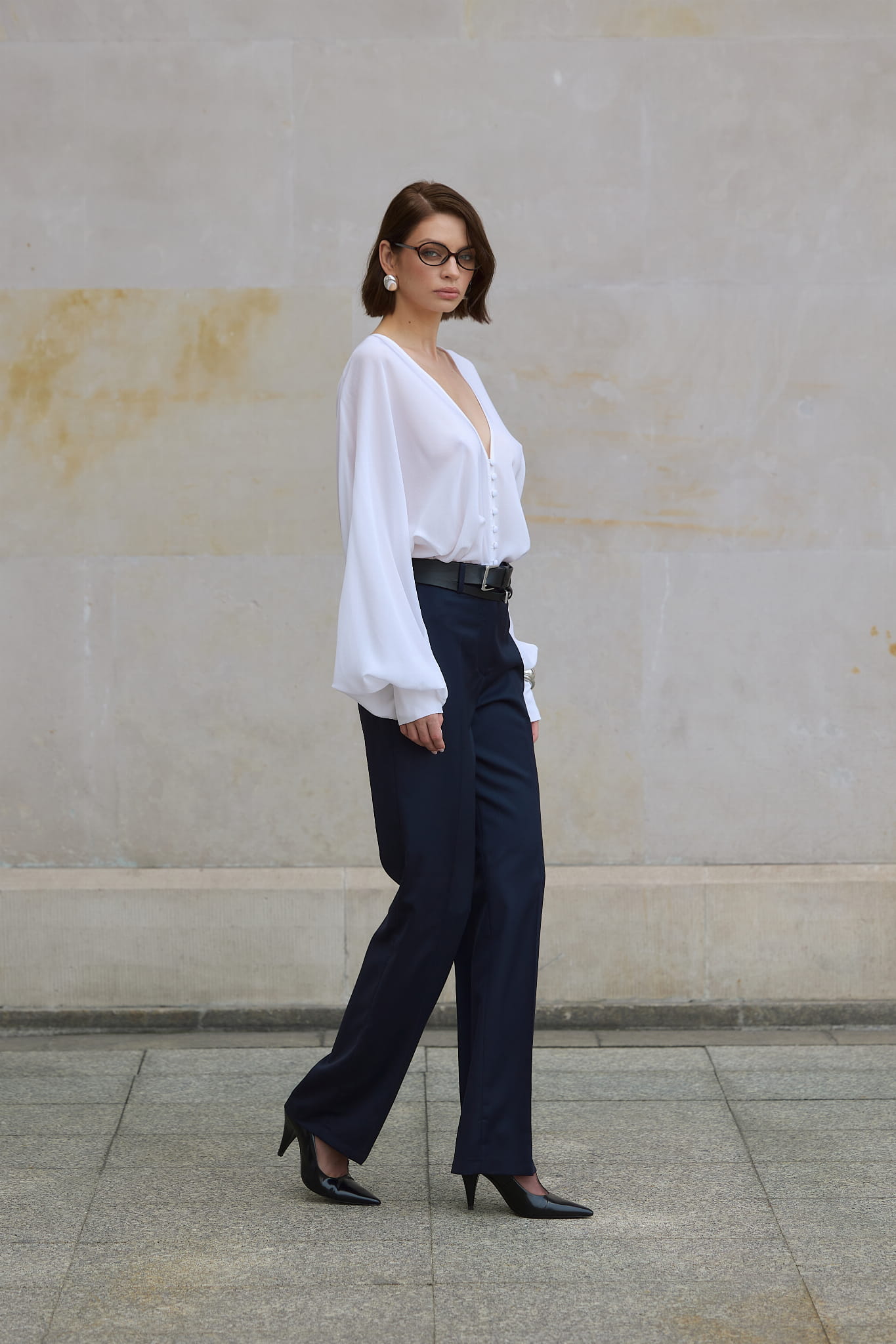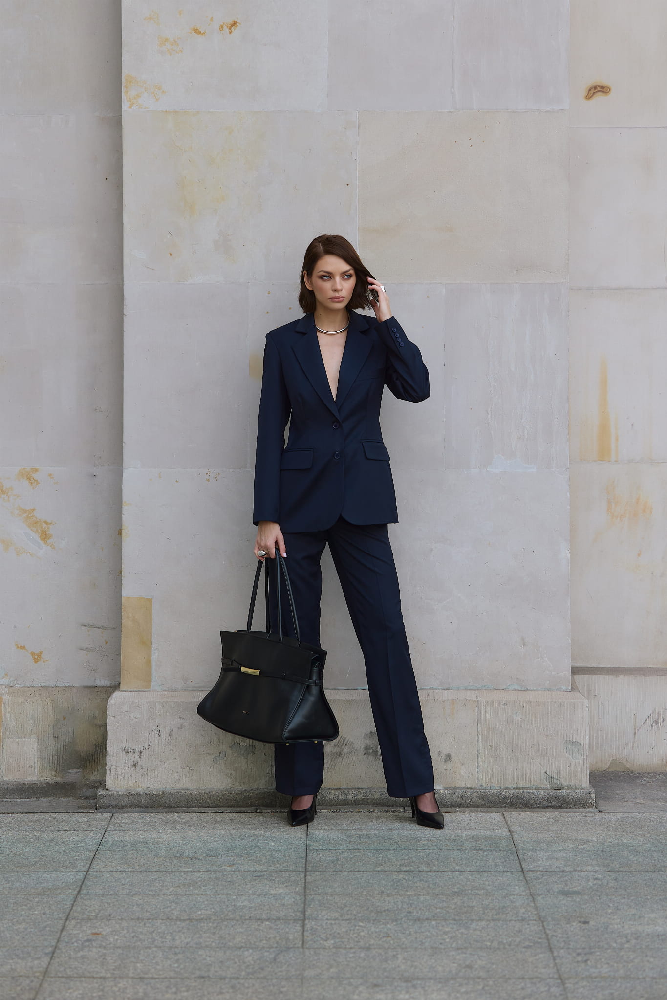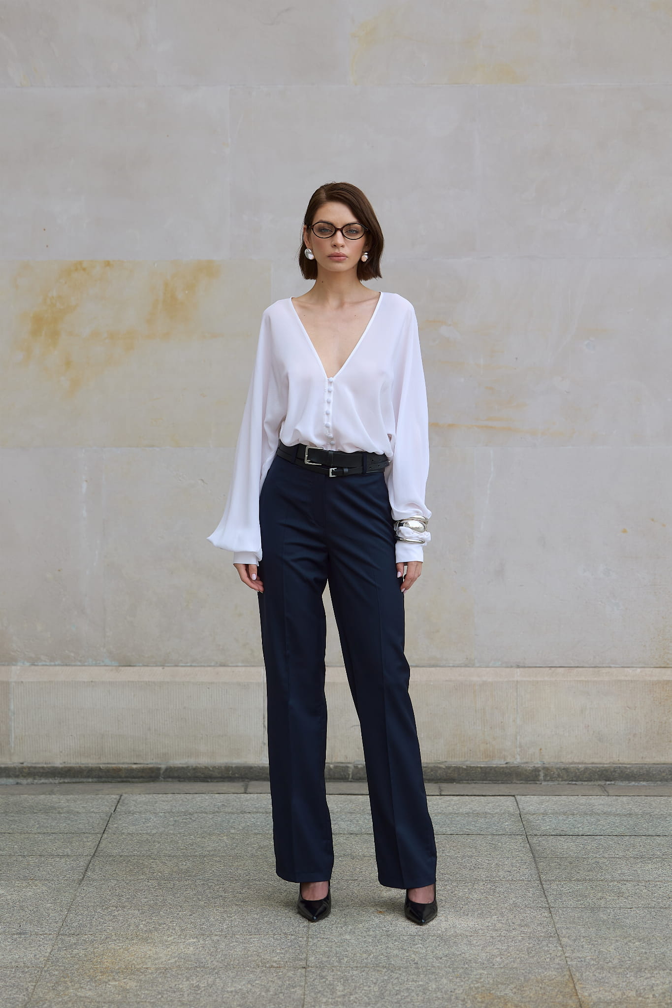 - Wysoki stan, klasyczne nogawki w kant lekko dopasowane