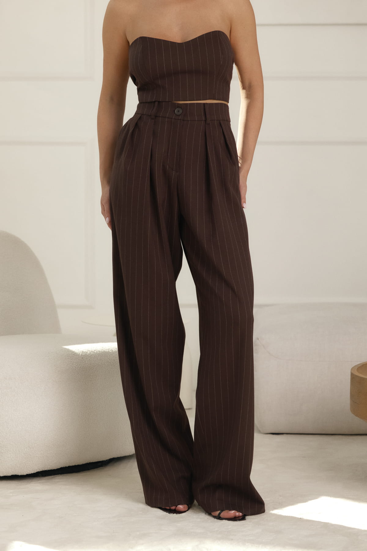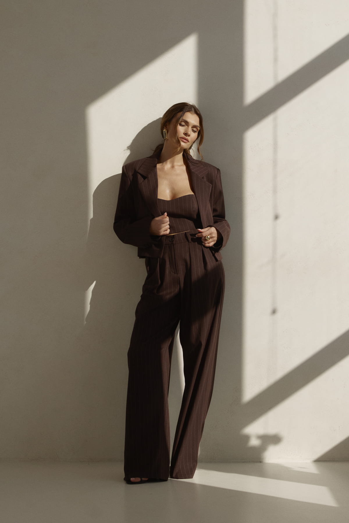 Spodnie Valeria w głębokim odcieniu brązu z subtelnym pionowym wzorem w paski to elegancki element nowoczesnego damskiego garnituru. Klasyczna forma została wzbogacona o współczesny krój, dzięki czemu model doskonale sprawdza się zarówno w stylizacjach eleganckich, jak i bardziej casualowych.